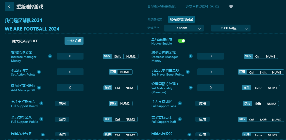 《我们是足球队2024》是一款最新的足球体育竞技游戏,带领你的球队成为冠军。六蓝游戏网提供《我们是足球队2024修改器》下载,为玩家提供增加金钱、设置行动点、设置国籍、设置增益点数、增加转会预算,完全支持、全部健身、无限体能、无新鲜度等全能五十九项游戏辅助,满足玩家对游戏体验的全部需求,游戏体验更佳!感兴趣的朋友不要错过,六蓝游戏网推荐大家下载体验!