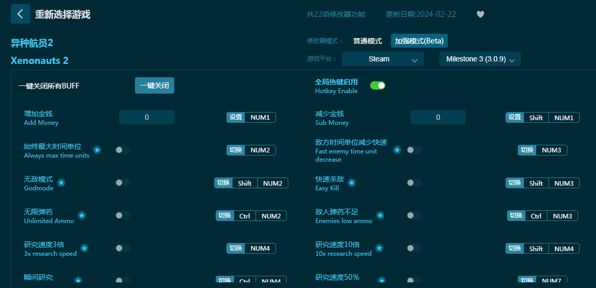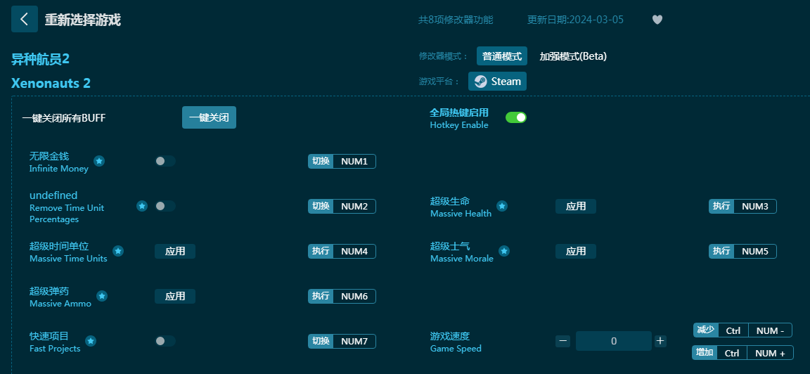 《异种航员2》是一款生存策略游戏,外星入侵玩家作为幸存者抵抗外星文明,建立避难基地并生存下去。这款《异种航员2修改器》专为玩家打造,内置无限金钱、超级生命、超级士气、超级时间单位、快速项目、游戏速度等八项强力辅助功能。有了异种航员2修改器,玩家游戏体验更轻松!感兴趣的朋友不要错过,六蓝游戏网推荐大家下载体验!