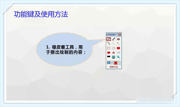 1、支持将屏幕内容存储为jpeg、jpg、bmp等通用图像文件格式,并支持将存储的图像文件显示到屏幕上;同时,支持剪贴板操作,可以将剪贴板中的图片和文字显示到屏幕上,或将屏幕上任何区域剪切下来粘贴到其他软件中。 2、通过快捷键F9可以快速切换红烛电子教鞭的显示状态,方便用户随时进行标注和绘图操作。 3、画图时按住Ctrl键、Alt键、Shift键,或它们的组合,可以画出各种特效,如反色内容等。 4、提供清屏功能,可以快速清除屏幕上的所有标注和绘图内容;同时,橡皮擦功能允许用户擦除部分标注内容。 5、内置放大镜功能,方便用户查看屏幕细节;同时,支持黑白板切换,满足不同教学或演示场景下的需求。