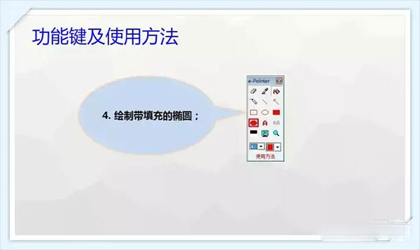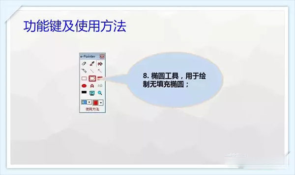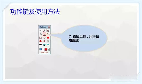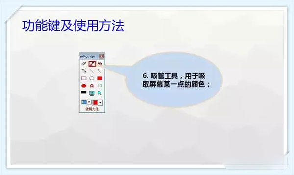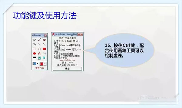 1、橡皮檫工具。 2、画笔工具。 3、绘制无填充矩形。 4、绘制填充椭圆。 5、切换屏幕。 6、吸管工具。 7、直线工具。 8、椭圆工具。 9、文字工具。 10、清除工具。 11、填充工具。 12、矩形工具。 13、放大镜工具。 14、设定颜色与线条粗细。 15、绘制虚线。