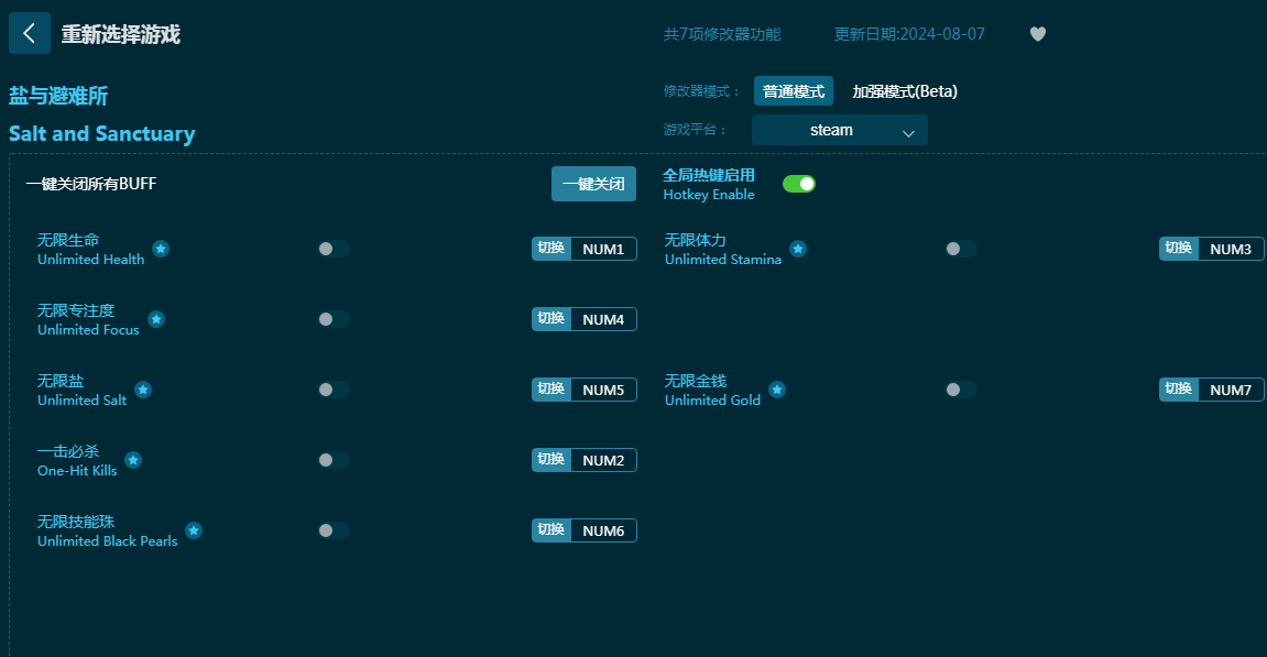 《盐与避难所修改器》专为经典动作游戏《盐与避难所》打造,玩家使用盐与避难所修改器可获得七项强力游戏辅助,包含无限生命、无限专注度、无限盐、一击必杀、无限体力、无限金钱、无限技能珠等。一键开启关闭,使用无广告安全绿色,游戏通关更简单!有需要的朋友不要错过,六蓝游戏网推荐大家下载体验!