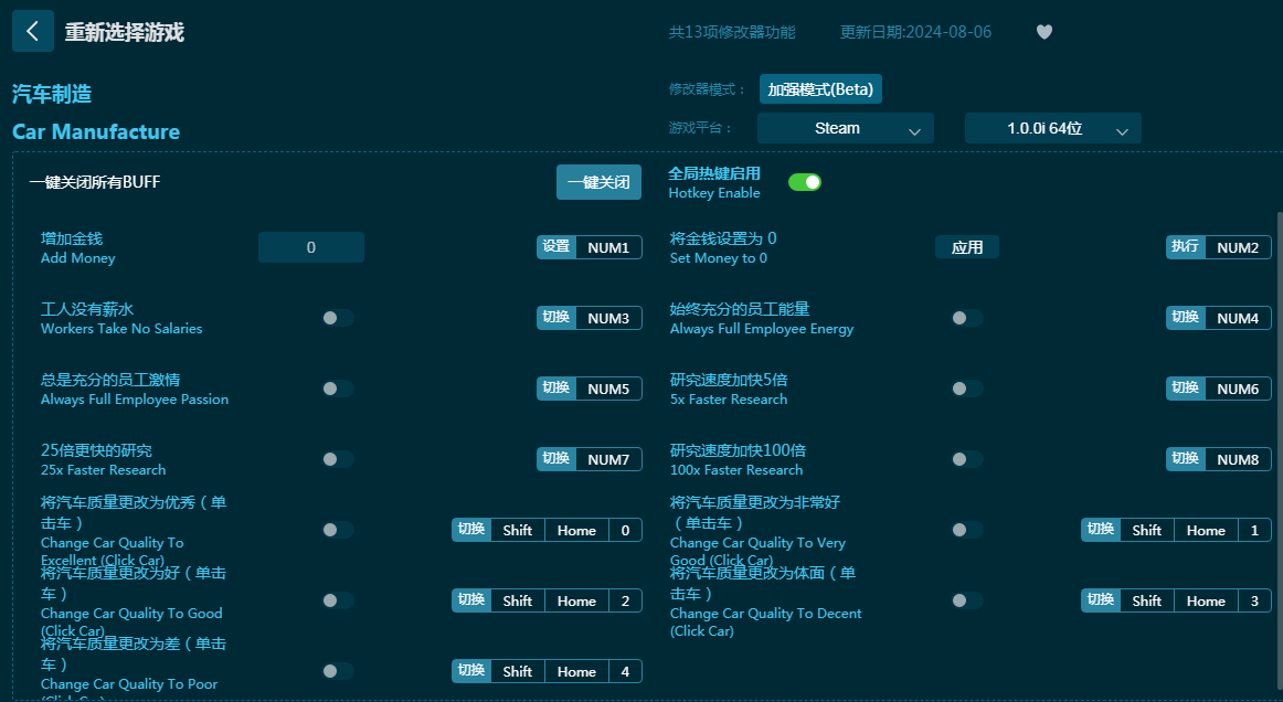 六蓝游戏网为玩家带来《汽车制造修改器》下载,专为Steam最新游戏《汽车制造》游戏打造,体验20世纪初的汽车制造经营游戏乐趣。汽车制造修改器能为玩家们提供增加金钱、不要薪水、充分员工能量、充分员工激情、加快研究速度、汽车质量更好等十三项游戏辅助。在游戏自己设计自己造车自己经营!有需要的朋友不要错过,六蓝游戏网推荐大家下载体验!