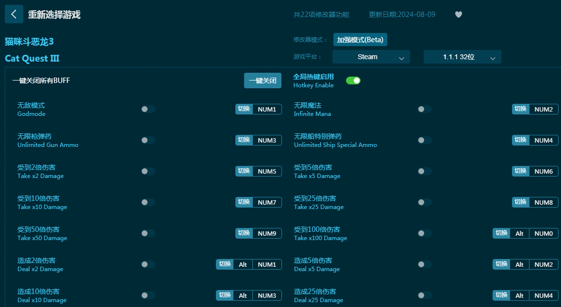 《猫咪斗恶龙3修改器》是为猫咪斗恶龙系列最新作《猫咪斗恶龙3》开发的游戏辅助工具。这款猫咪斗恶龙3修改器能为玩家提供二十二项全能游戏辅助,包括无敌模式、无限枪弹药、无限魔法、设置受到伤害、设置造成伤害、增加经验、设置水晶等,全部可以免费使用,帮助玩家在游戏中征服未探索的海域!感兴趣的朋友不要错过,六蓝游戏网推荐大家下载体验!