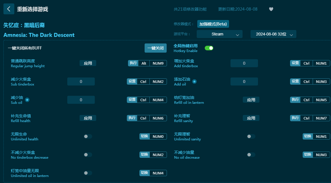 《失忆症黑暗后裔修改器》是一款为经典惊悚恐怖游戏《失忆症黑暗后裔》开发的游戏辅助工具。游戏中玩家要在黑暗空间中躲避不知名生物的追杀。这款《失忆症黑暗后裔修改器》能为玩家提供设置行走速度、设置奔跑速度、设置跳跃高度、增加火柴盒、增加油、无限生命、无限理智等二十一项辅助,帮助玩家逃生!有需要的朋友不要错过,六蓝游戏网推荐大家下载体验!