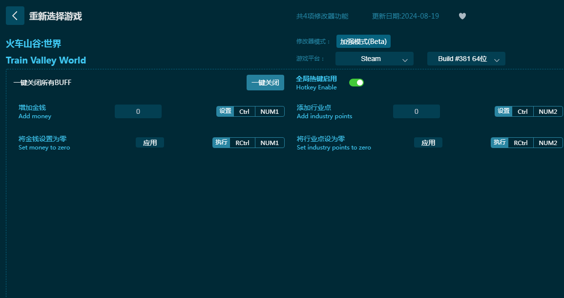 《火车山谷世界》是最新的Steam铁路模拟游戏,建设铁路征服世界。这款《火车山谷世界修改器》专为游戏制作,可为玩家提供增加金钱、添加行业点等强力游戏辅助。有了火车山谷世界修改器,帮助玩家的铁路帝国建设更轻松!感兴趣的朋友不要错过,六蓝游戏网推荐大家下载体验!