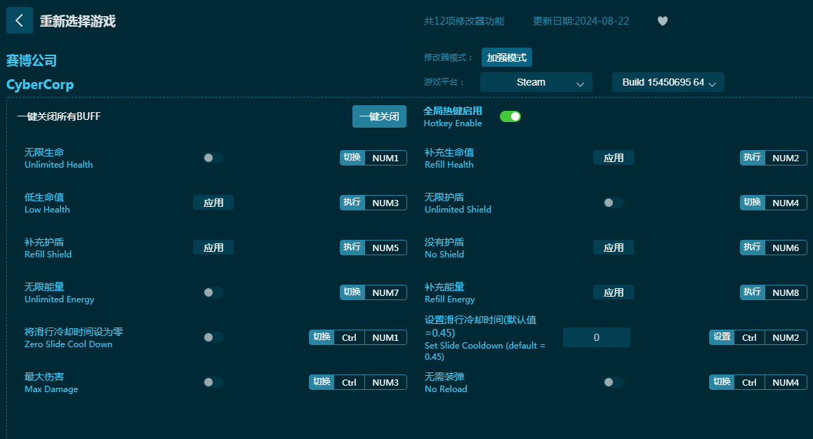 《赛博公司修改器》是一款专为游戏赛博公司制作的强力游戏辅助工具。赛博公司是一款最新的策略动作射击游戏,和队员配合爽快射击。赛博公司修改器能为玩家提供无限生命、无限护盾、无限能量、最大伤害、没有冷却时间、无需装弹等强力功能,玩家可以免费使用,让游戏更轻松通关!感兴趣的朋友不要错过,六蓝游戏网推荐大家下载体验!
