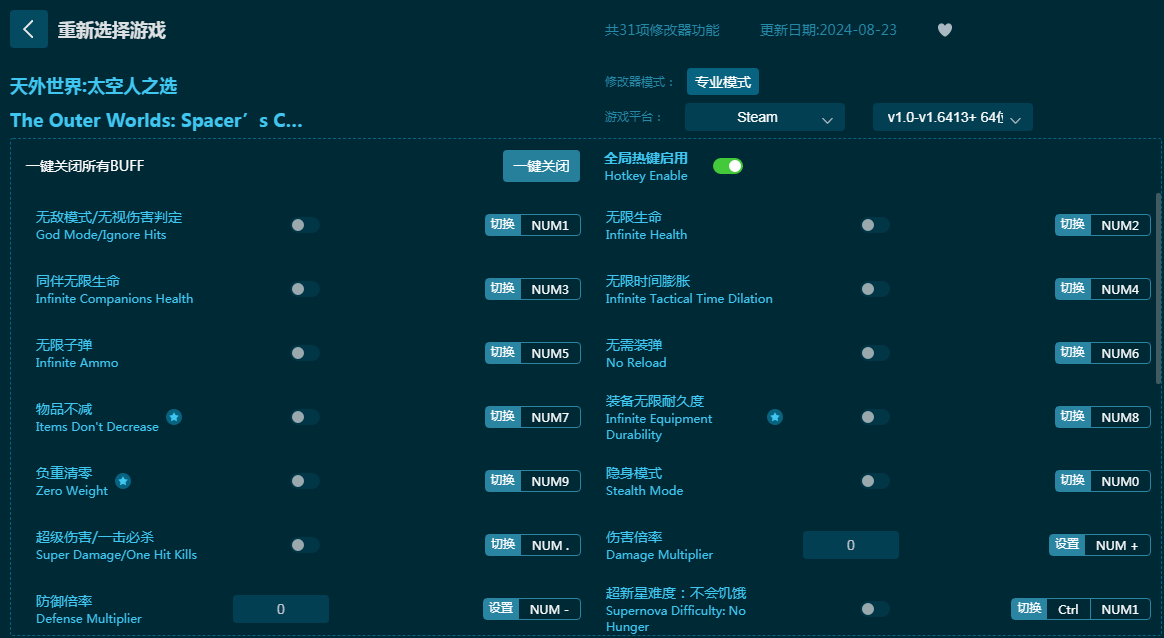 《天外世界太空人之选修改器》专为游戏天外世界太空人之选制作的全能游戏辅助工具。天外世界太空人之选修改器带来:无敌模式、无限生命、无限时间膨胀、无限子弹、物品不减、一击必杀、隐身、不会饥饿等三十一项辅助,玩家可以全部使用,游戏更简单通关!有需要的朋友不要错过,六蓝游戏网推荐大家下载体验!