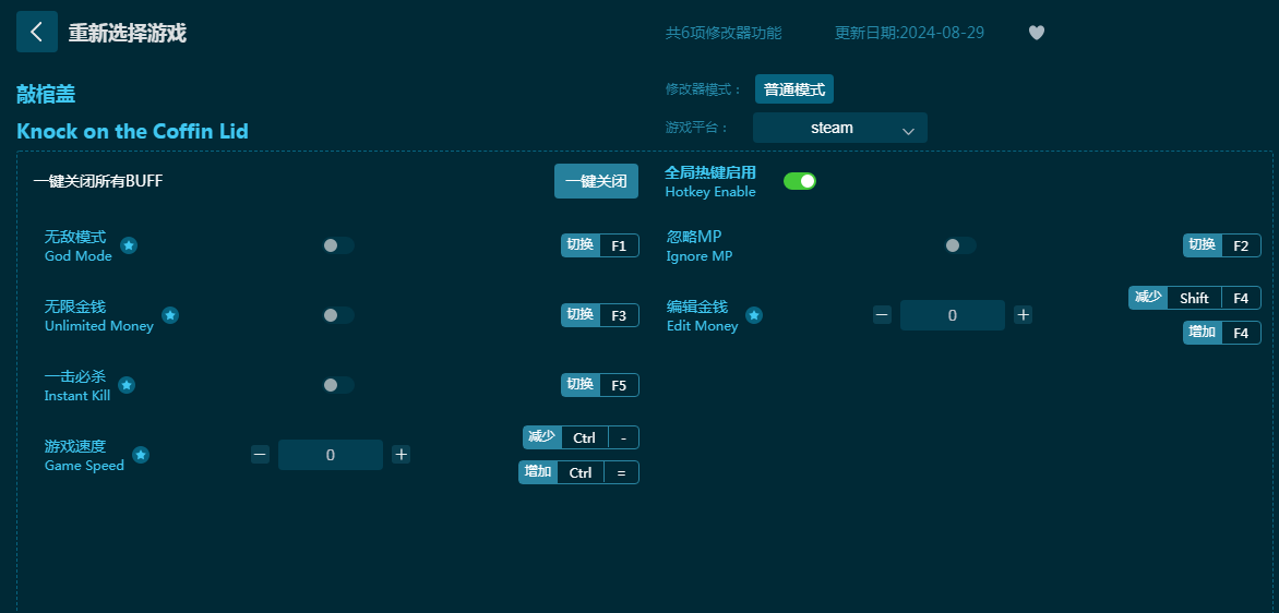 《敲棺盖修改器》是一款功能强大的游戏修改器,专为游戏敲棺盖制作。敲棺盖修改器可为玩家在游戏中提供:无敌模式、无限金钱、一击必杀、设置游戏速度、无限MP等六项强力辅助。且敲棺盖修改器实时更新,免费使用,帮助降低玩家游戏难度!有需要的朋友不要错过,六蓝游戏网推荐大家下载体验!