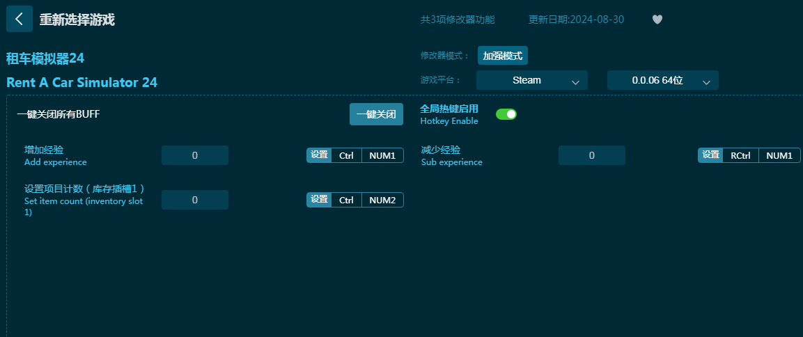 《租车模拟器24修改器》是专为最新游戏租车模拟器24制作的游戏辅助工具。租车模拟器24修改器可为玩家提供设置经验、设置项目计数等辅助功能,后续还会更新,且可以免费使用。使用租车模拟器24修改器,能让你的游戏体验更佳!感兴趣的朋友不要错过,六蓝小编推荐大家下载体验!