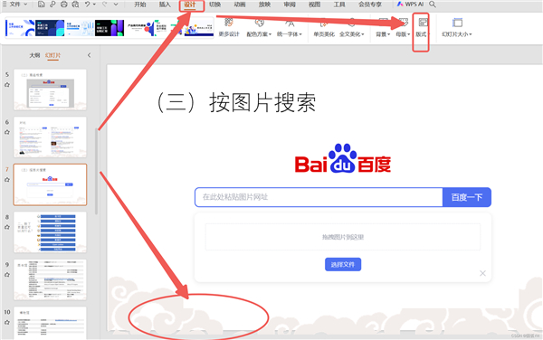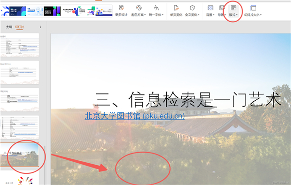3、在菜单栏目中的“设计”中,可以查看这种页面所在的“版式”。不同版式,可以插入不同类型的符号,以便区分;