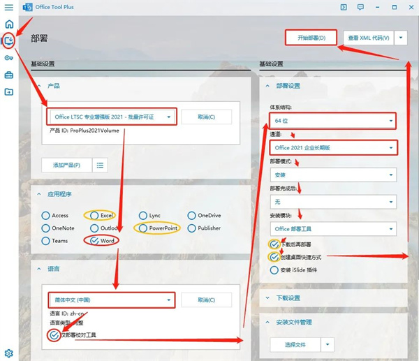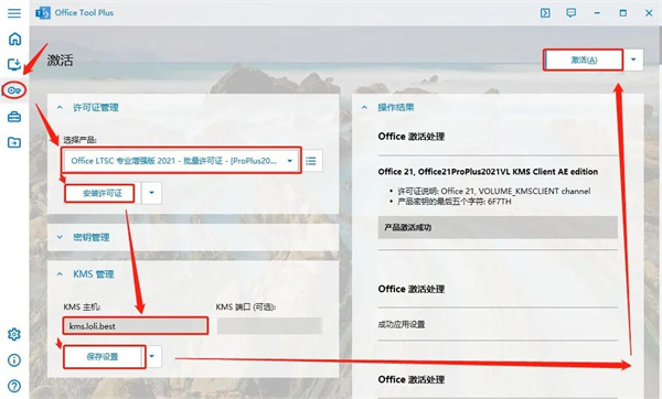 1、打开下载好并解压好的文件夹里面的"Office Tool Plus.exe"。 2、按图操作(图中产品一定要选中"Office LTSC专业增强版 2021 - 批量许可证"不要选错否则激活不了,图里我只选word单独产品来演示,有需要的同学可以自行勾上 Excel、PPT等产品)。 3、安装完成!!点关闭。先别打开,等激活后再打开。 4、按图操作(产品选择"Office LTSC 专业增强版 2021 - 批量许可证..."不要选错否则激活不了,KMS主机填"kms.loli.best",图中的"安装许可证"及"保存设置"按钮选完填完后一定要点一下)。 5、点上图"激活"后显示下图"产品激活成功"就表示已经激活啦赶紧打开试试吧! 6、打开 word 点击左下角的"账户"就能查看激活状态啦!