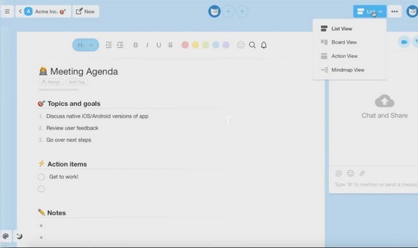 在主窗口中,您需要从指示要存储的内容类型开始。因此,您可以创建一个检查表、大纲、笔记,或者转到模板,例如每周任务、会议笔记、头脑风暴、团队回顾等等。
