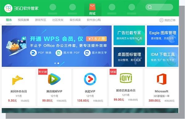 5、360软件管家内置软件商城,提供软件会员、游戏点卡等一站式购物服务。