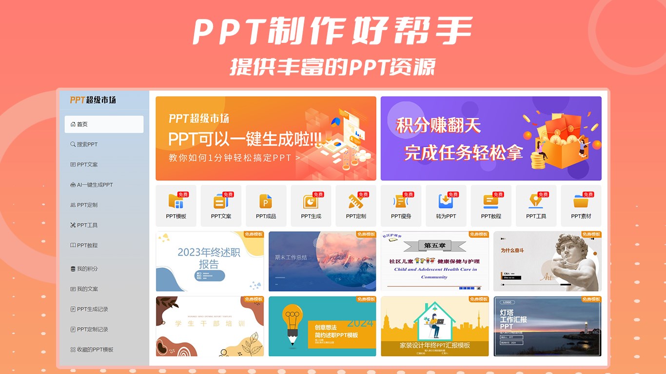 1、PPT超级市场集成了PPT模板下载、PPT定制、AI生成PPT等多种功能于一体,为用户提供了一站式的PPT解决方案。无论是需要快速找到合适模板进行下载,还是希望通过AI技术自动生成高质量的PPT,PPT超级市场都能满足需求。