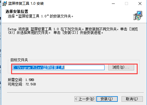 2、进入安装位置选择界面,您可以点击【安装】软件会默认安装,或者您可以点击【浏览】在打开的选择安装位置界面中,您可以自行选择蓝屏修复工具的安装位置,选择完成后点击【安装】就可以了。