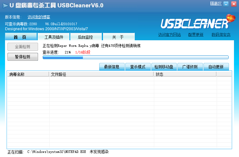 1、专注于检测并清除U盘、移动硬盘等设备中的2250余种病毒,包括Auto.exe等顽固木马,支持广谱扫描应对未知威胁。