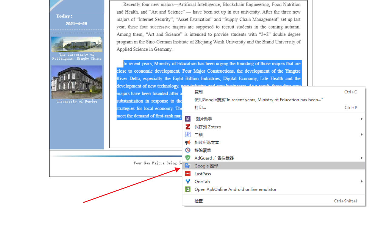 2、新建窗口翻译。如果你不想使用划词翻译这种操作的话,可以选中需要翻译的文本内容,右击鼠标菜单栏找到此chrome插件,打开新的窗口进行内容翻译,且支持多语言切换。